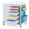 Тележка оснащена шестью навесными ёмкостями: двумя вёдрами с крышками (175×175×230 мм), двумя банками (Ø 130×140 мм), откидным контейнером (345×100×360 мм) и навесным лотком (315×160×130 мм). Доска для сердечно-лёгочной реанимации (535×415×20 мм), держатель баллона с ремнями и розетка с кабелем (2,5 м) обеспечивают функциональность в критических ситуациях. Четыре колеса Ø 124 мм с полиуретановыми шинами и тормозами на двух передних колёсах гарантируют мобильность. Габариты (950×540×1065 мм) и масса (42–51,9 кг) обеспечивают устойчивость. Все поверхности устойчивы к дезинфекции.